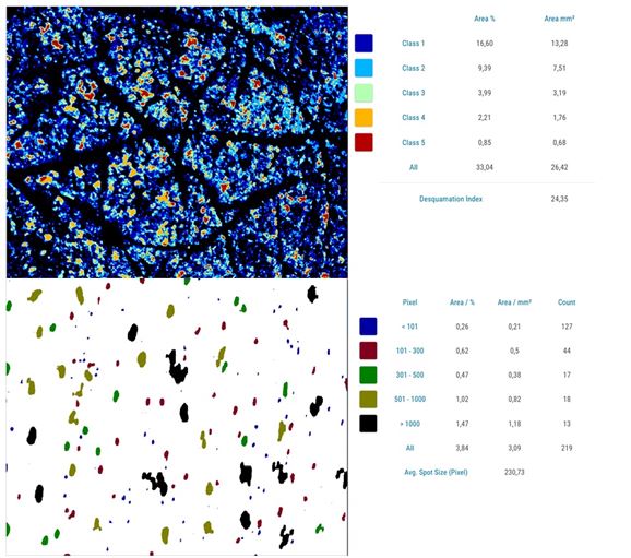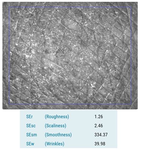 - Special parameters have been created to describe virtually the skin topography volume (mm²) and unfolded surface in %.